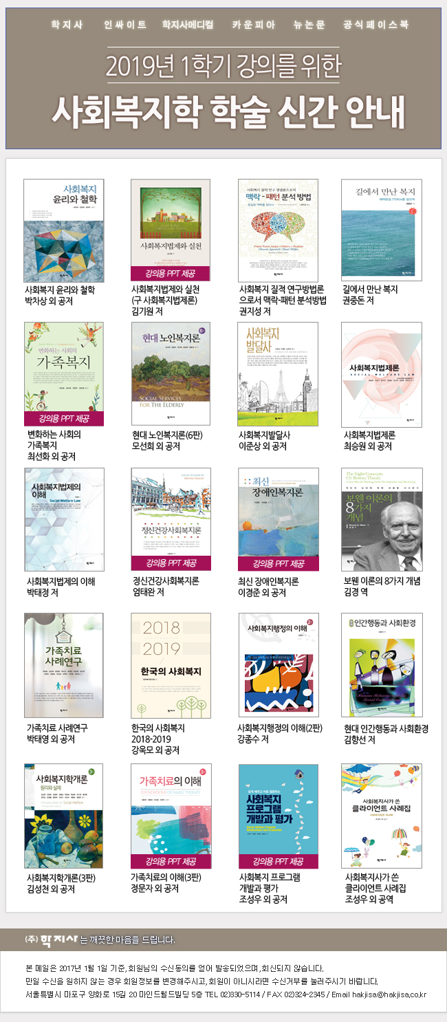 정신건강사회복지론 / 가족치료의 이해 / 사회복지 프로그램 개발과 평가 등 2019 사회복지학 학술 신간 안내