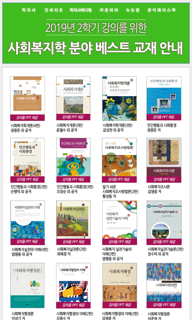 사회복지학개론 / 사회복지법제와 실천 / 노인복지론 등 2019 사회복지학 분야 베스트 교재 안내