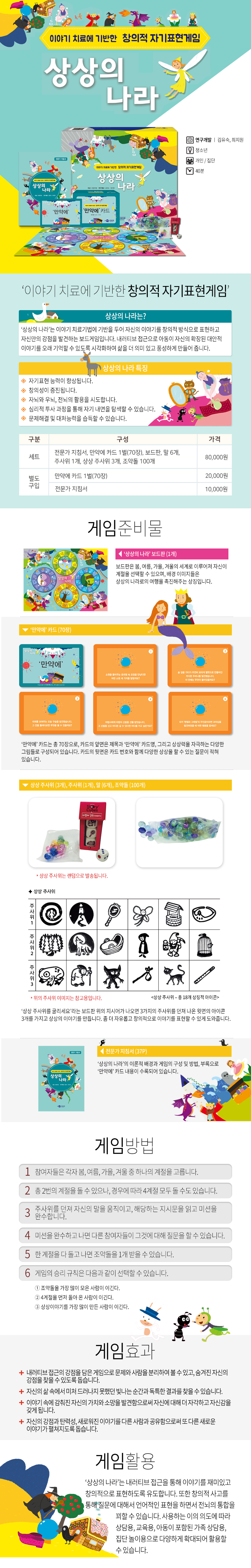 • 상상의 나라는 내러티브 접근을 통해 재미있고 신나는 창의적 이야기를 표현하게끔 유도합니다. 또한, 질문에 대한 답을 통한 언어적 표현과 창의적인 사고를 통해서 전뇌의 통합을 꾀할 수 있습니다. 사용하는 이의 의도에 따라 상담용, 교육용, 아동이 포함된 가족 상담용, 집단 놀이용으로 다양하게 확대되어 사용할 수 있습니다.