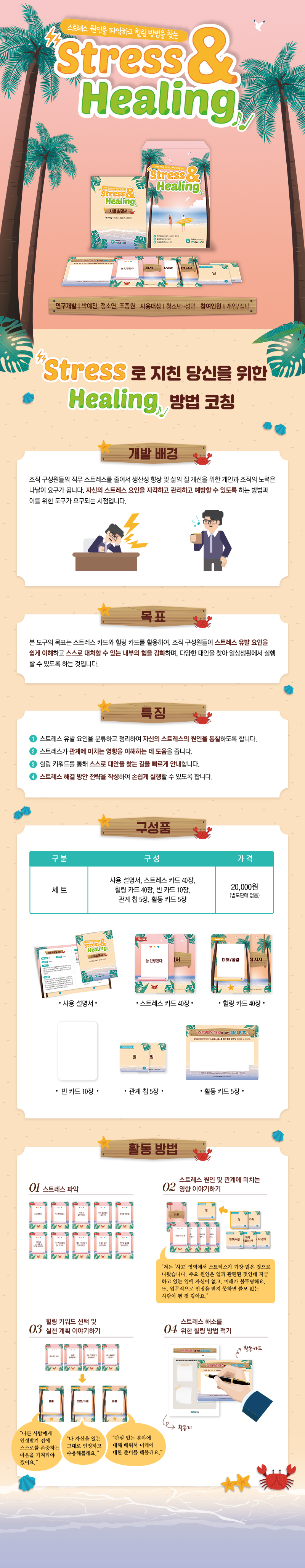 스트레스&힐링은 스트레스 카드와 힐링 카드를 활용하여 조직 구성원들이 스트레스 유발 요인을 쉽게 이해하고 스스로 대처할 수 있는 내부의 힘을 강화하며, 다양한 대안을 찾아 일상생활에서 실행할 수 있도록 하는 도구입니다.