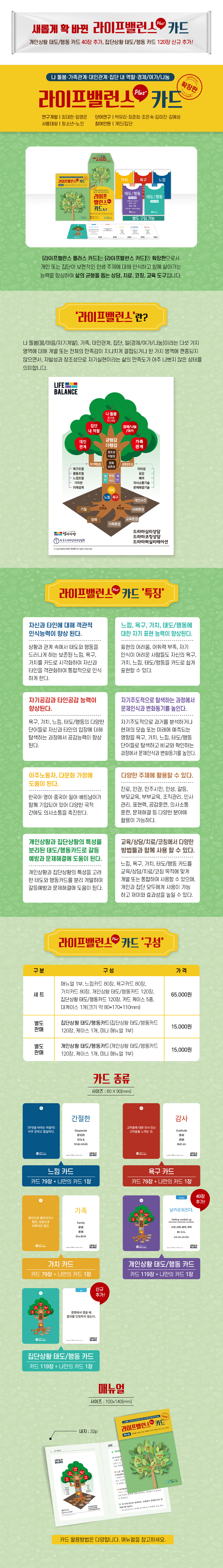 [라이프밸런스 플러스 카드]는 [라이프밸런스 카드]의 확장판으로서 개인 또는 집단이 보편적인 인생 주제에 대해 인식하고 함께 살아가는 능력을 향상하여 삶의 균형을 돕는 상담, 치료, 코칭, 교육 도구입니다