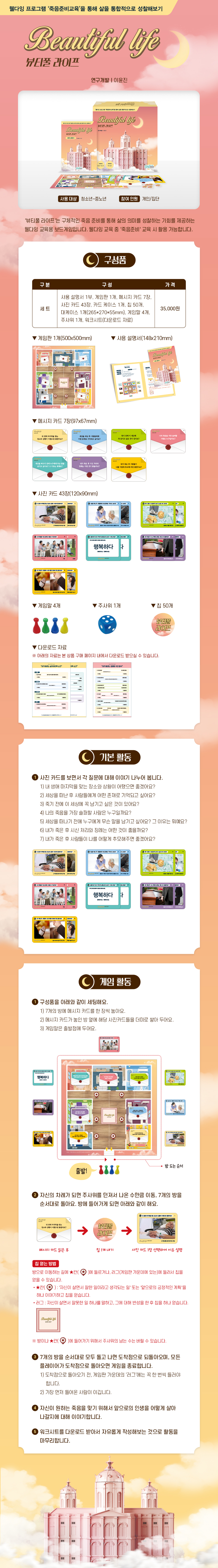 '뷰티풀 라이프'는 구체적인 죽음 준비를 통해 삶의 의미를 성찰하는 기회를 제공하는 웰다잉 교육용 보드게임입니다. 웰다잉 교육 중 '죽음준비' 교육 시 활용 가능합니다.