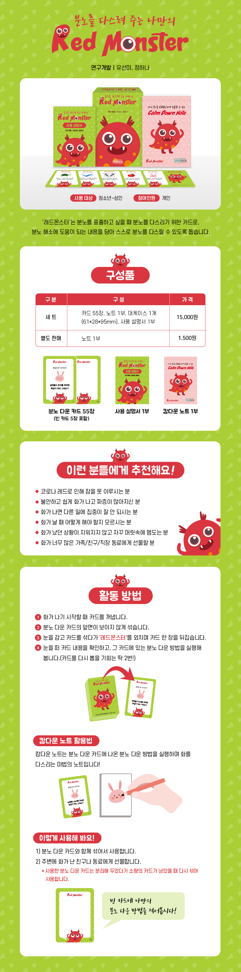 '레드몬스터'는 분노를 표출하고 싶을 때 분노를 다스리기 위한 카드로, 분노 해소에 도움이 되는 내용을 담아 스스로 분노를 다스릴 수 있도록 돕기 위한 도구입니다.
