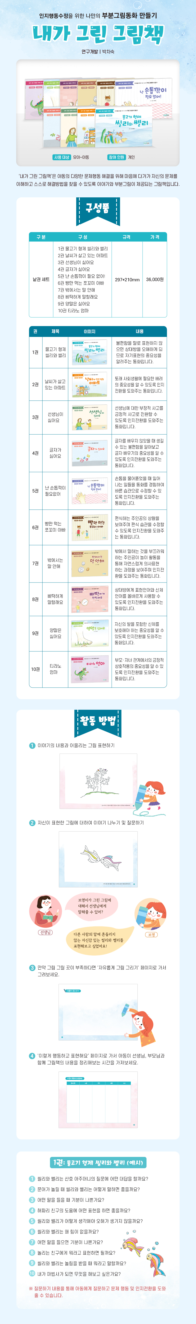 '내가 그린 그림책'은 아동의 다양한 문제행동 해결을 위해 마음에 다가가 자신의 문제를 이해하고 스스로 해결방법을 찾을 수 있도록 이야기와 부분그림이 제공되는 그림책입니다.