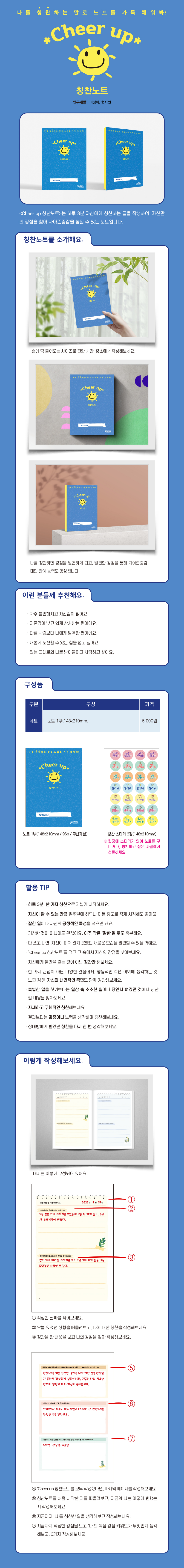 'Cheer up 칭찬노트'는 하루 3분 자신에게 칭찬하는 글을 작성하여, 자신만의 강점을 찾아 자아존중감을 높일 수 있는 노트입니다.
